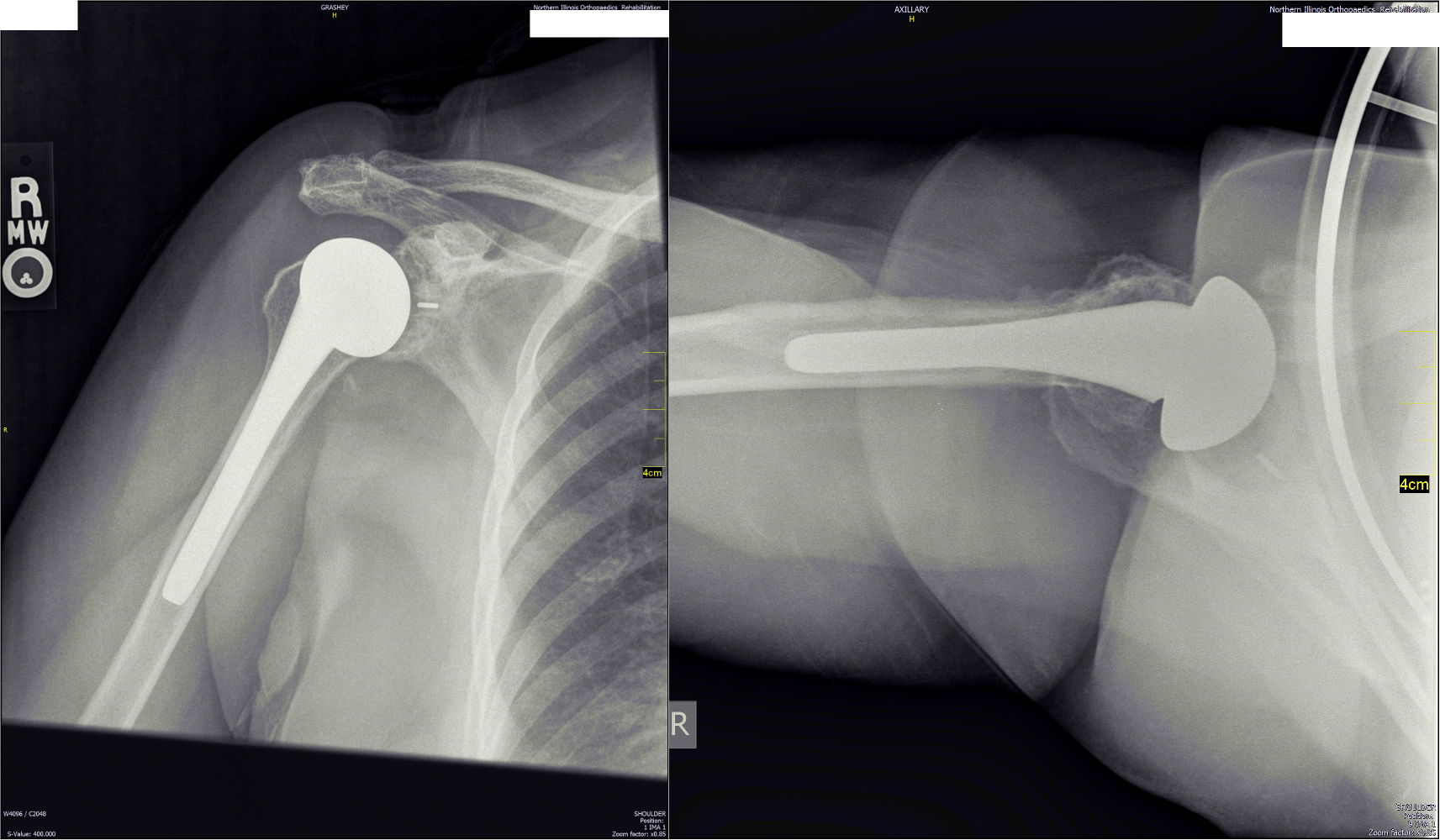 Below are xrays after surgery. This is a typical appearance of a shoulder replacement on xray. This is the same patient picture above, 3 years after her right shoulder replacement.
