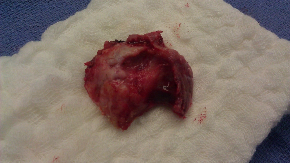 Below is a picture of the deformed head of the humerus that was removed during surgery. This was accomplished with a motorized power saw.