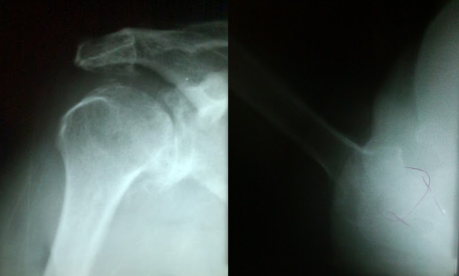 In the xrays below, note the irregular appearance of both the glenoid and humerus, the inferior ostephyte, and the degenerative cysts.