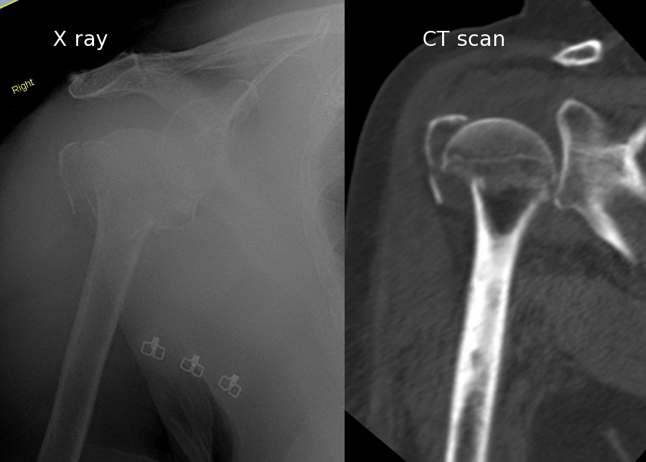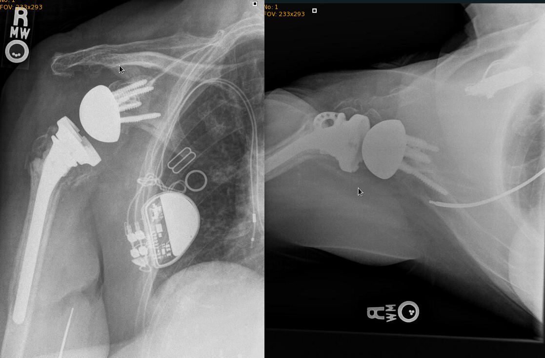 The xrays below are from a patient with left sided rotator cuff arthropathy. Patient presented with chronic shoulder pain and difficulty raising arm.