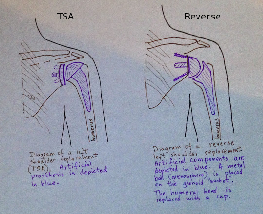 Like a regular shoulder replacement, a reverse shoulder replacement is performed by using power saws, reamers, chisels, etc., to remove bone from both sides of the glenohumeral joint. The removed bone is then replaced with artificial materials.