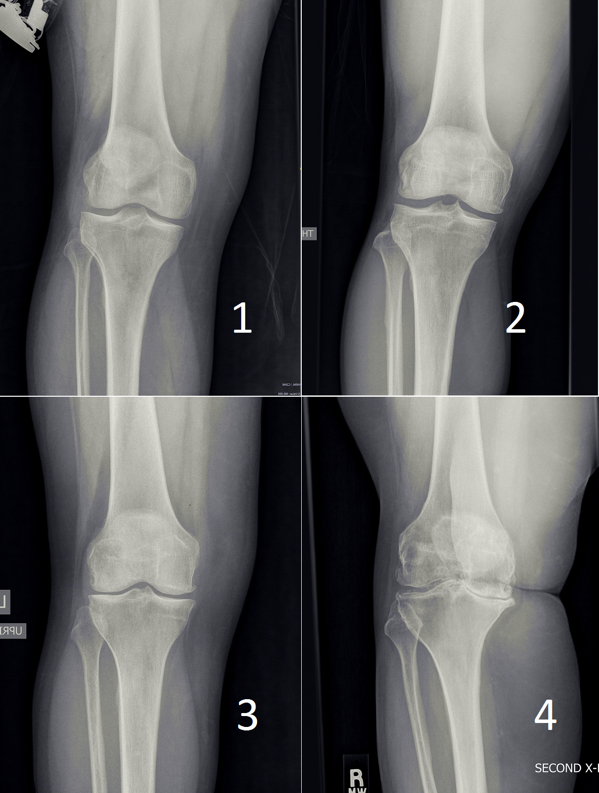 The following picture shows xrays of patients with different grades of arthritic disease. Grade 1, the mildest, has "doubtful" findings on xray. At the other end of the spectrum grade 4 has "bone-on-bone" disease, deformity, large osteophytes, and so on.