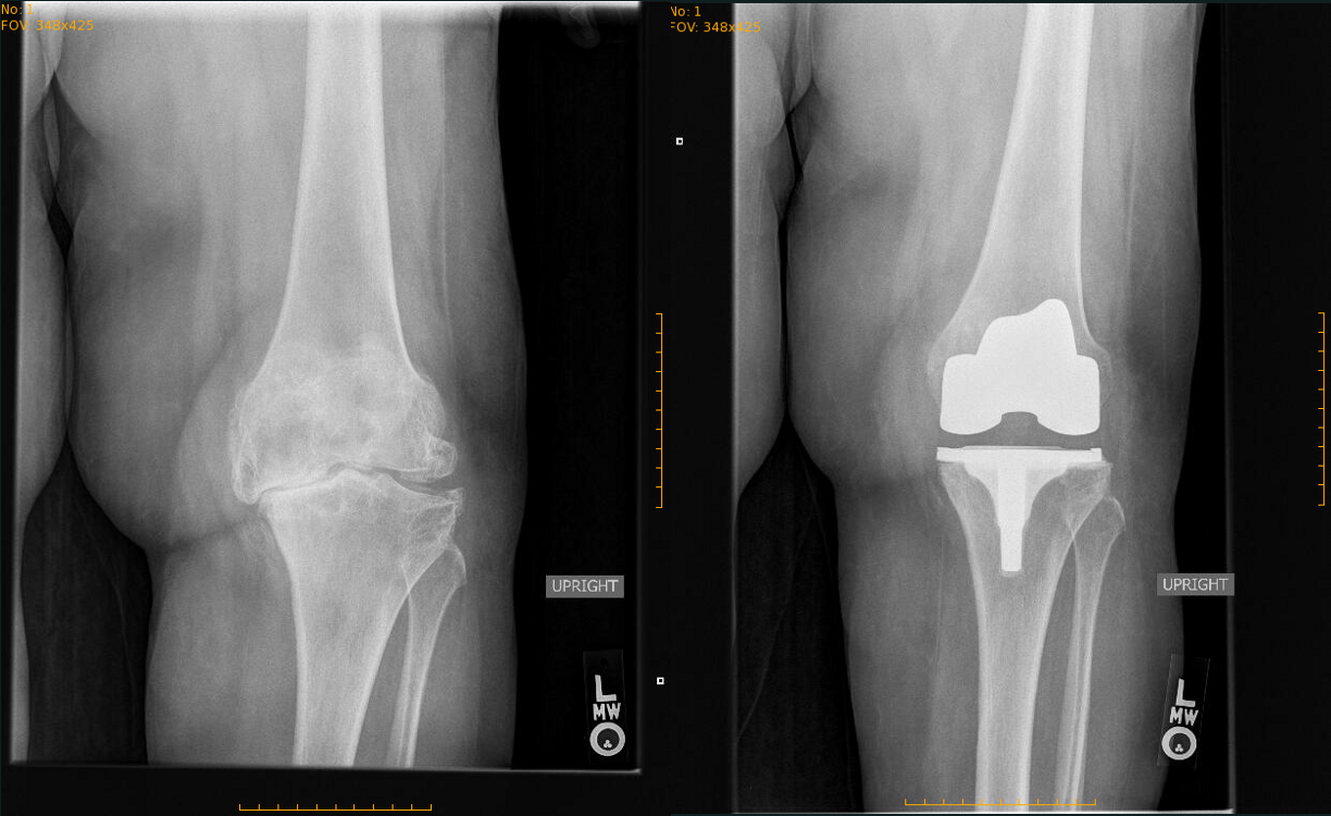 Before and after pictures of a knee replacement of a very arthritic knee that I treated with knee replacement.