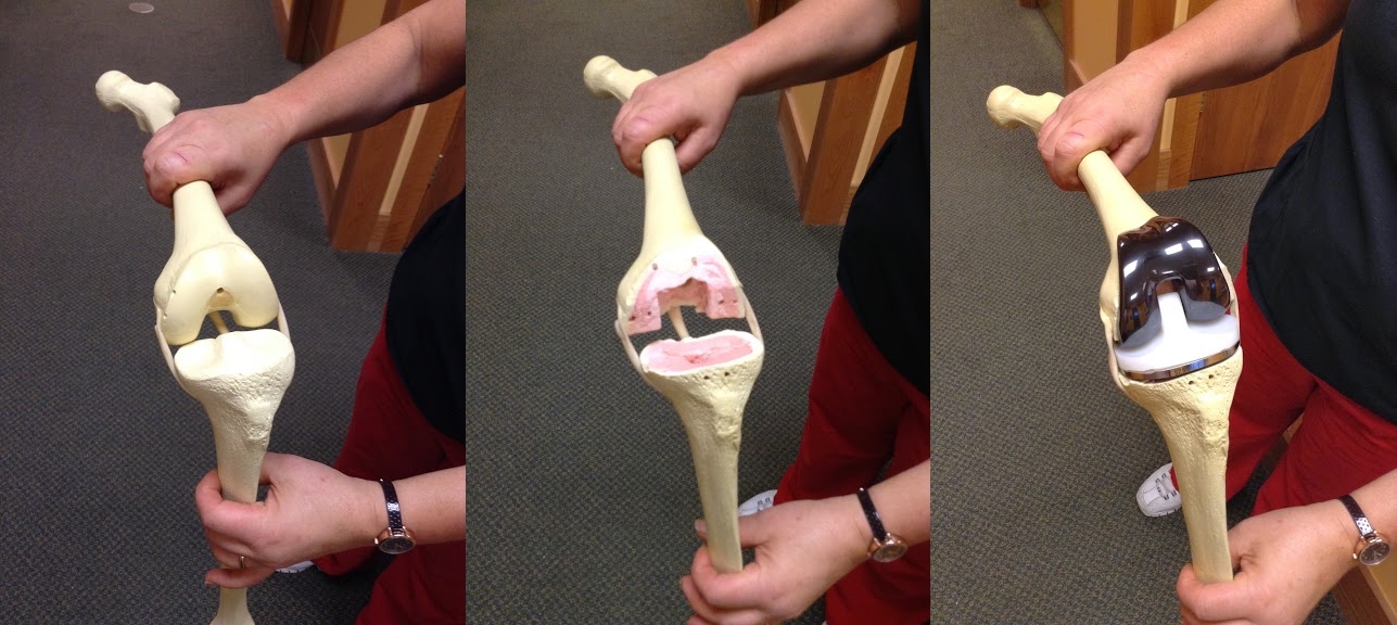 "Knee replacement" is surgery in which a layer of bone is removed from all three knee bones of the knee. The removed layer is then replaced with artificial material, namely metal and plastic.